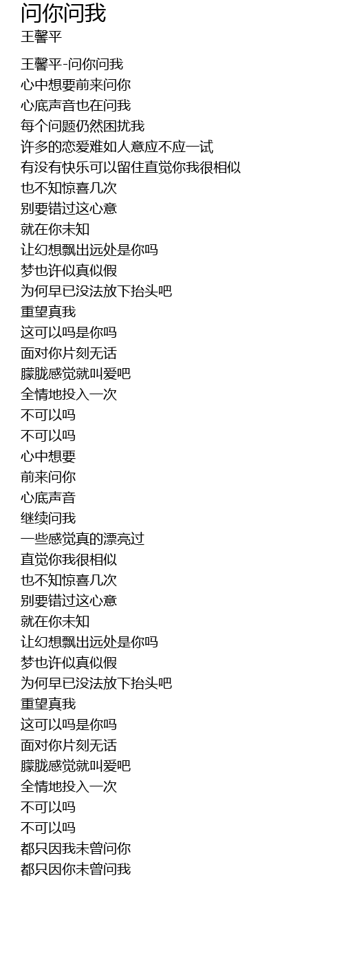 | [00:09.286] | wáng xīn píng wèn nǐ wèn wǒ |