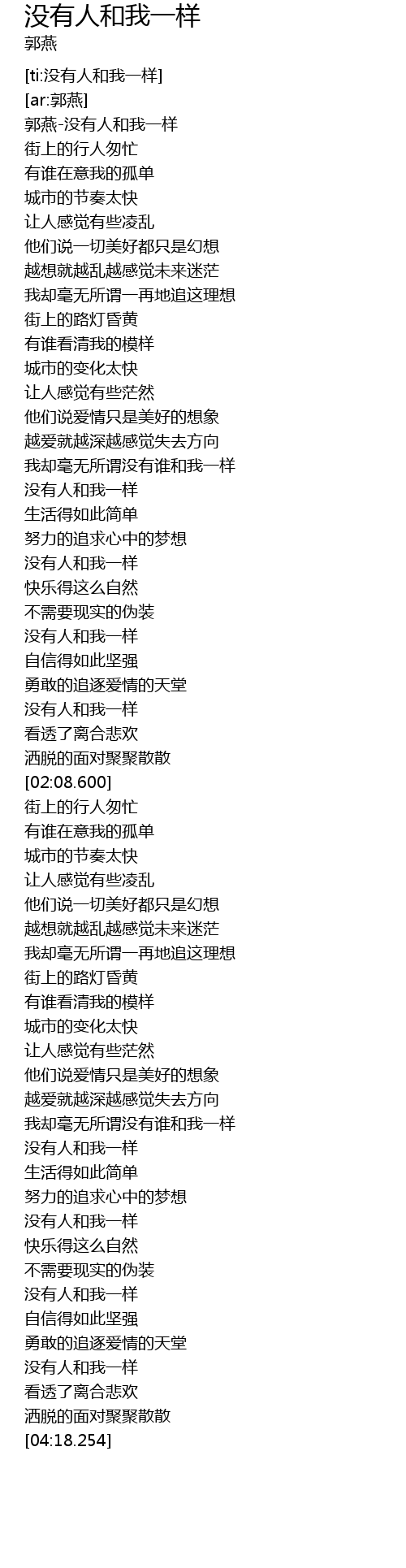 | [00:00.496] | 郭燕-没有人和我一样 |