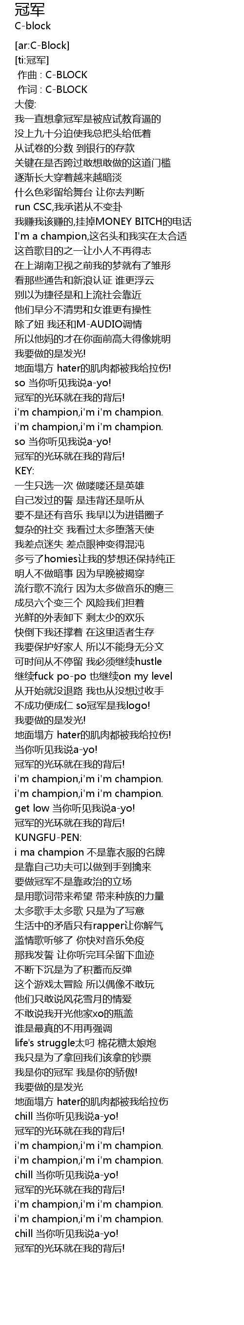 | [01:11.75] | i'm champion,i'm i'm champion. |