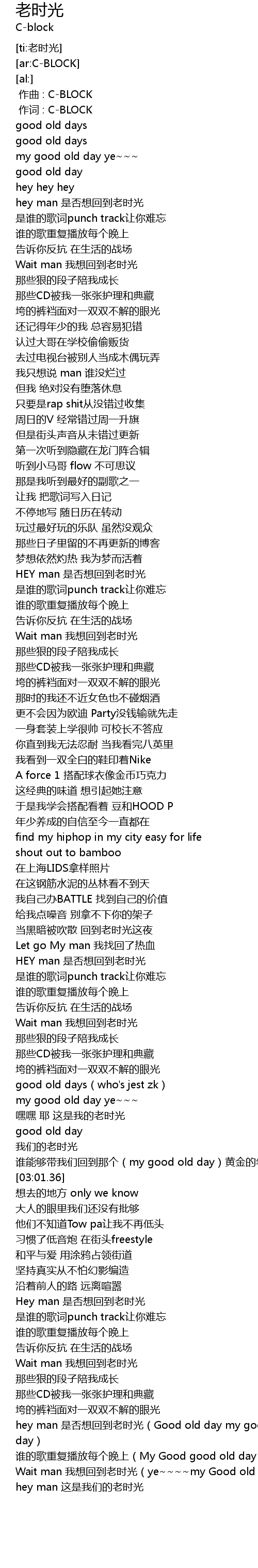 | [03:41.59] | hey man shì fǒu xiǎng huí dào lǎo shí guāng Good old day my good good old day |