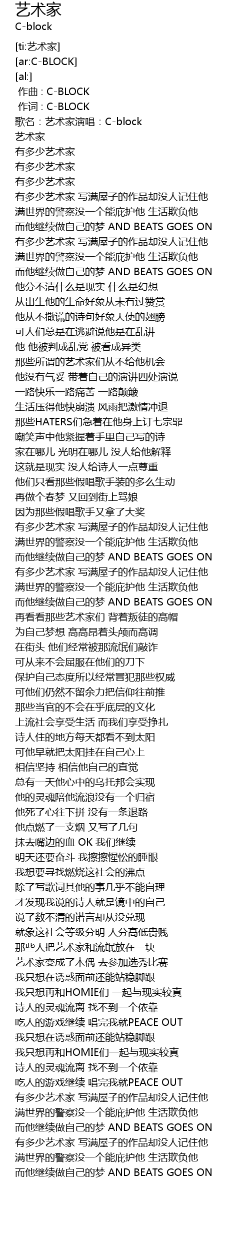 | [00:03.75] | 歌名:艺术家演唱:C-block |