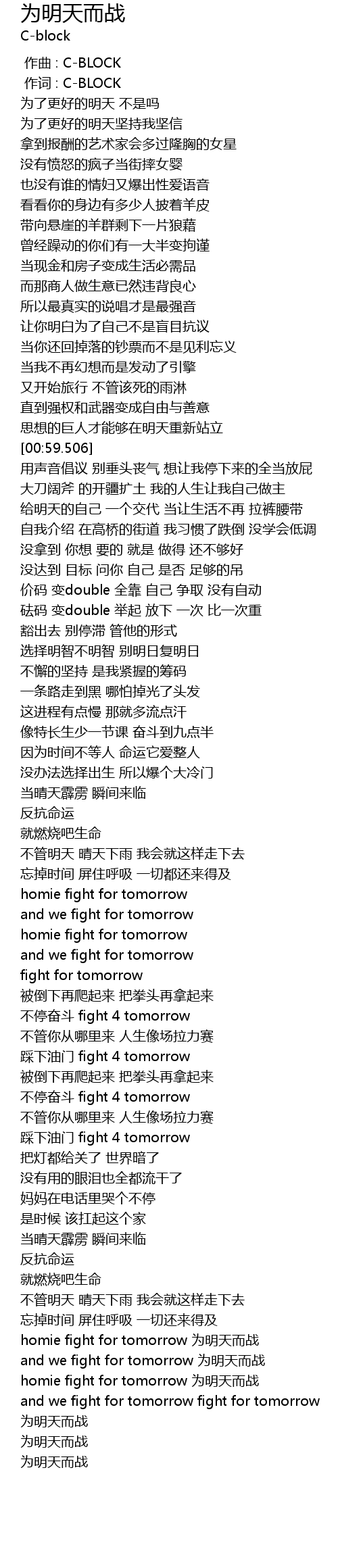 | [03:21.957] | homie fight for tomorrow wèi míng tiān ér zhàn |