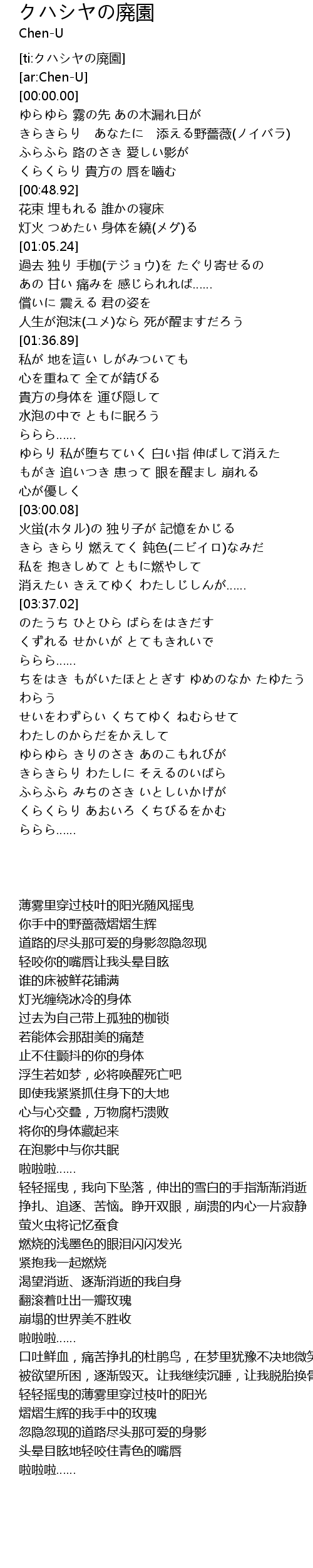 | [04:25.42] | せいをわずらい くちてゆく ねむらせて わたしのからだをかえして |