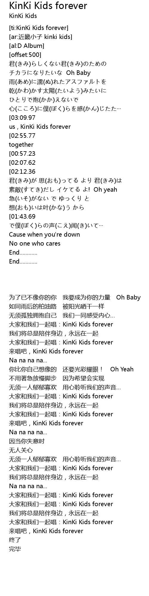 | [03:19.34][03:09.97][03:05.18][02:51.13][01:53.63][00:47.90] | Everybody sing with us , KinKi Kids forever |
