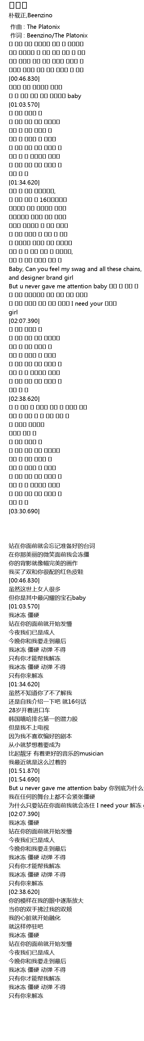| [00:01.00] | 作词 : Beenzino/The Platonix |