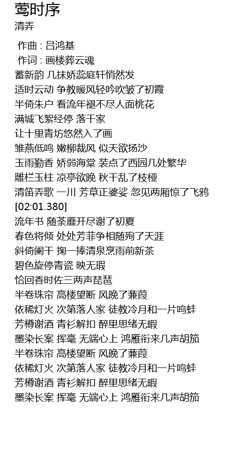 | [01:49.310] | 清笛弄歌 一川 芳草正婆娑 忽见两厢惊了飞鸦 |