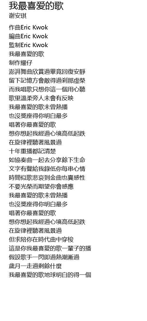 | [00:06.579] | wǒ zuì xǐ ài de gē |