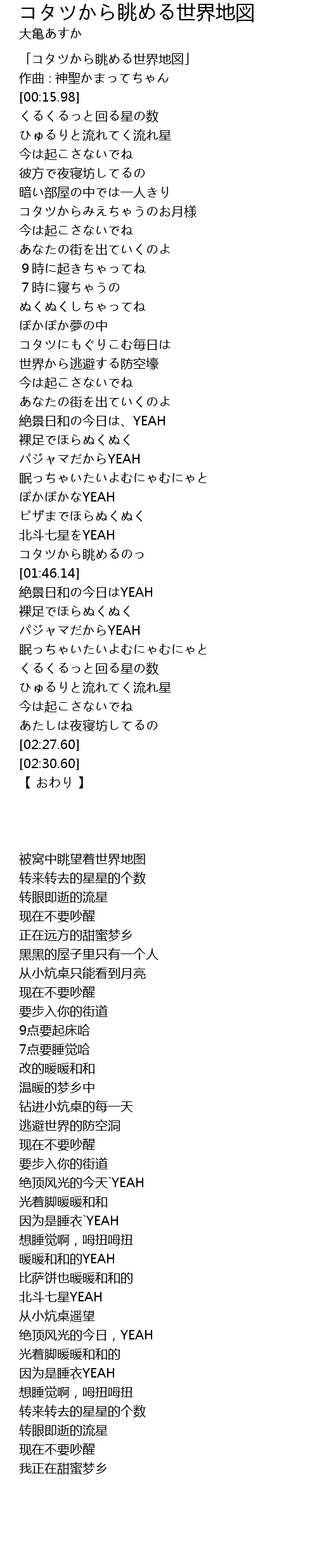 | [00:01.98] | 「コタツから眺める世界地図」 |