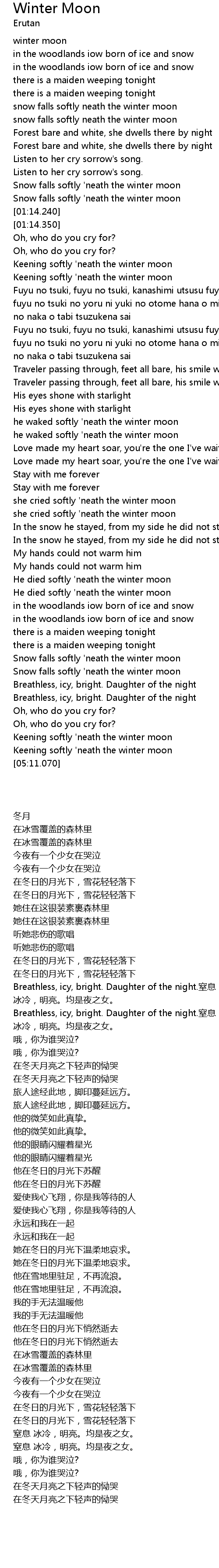 Fuyu no tsuki, fuyu no tsuki, kanashimi utsusu fuyu no tsuki Kogoeru fuyu no tsuki no yoru ni yuki no otome hana o mistuke ni yuki ni umoreta sanrin no naka o tabi tsuzukena sai |