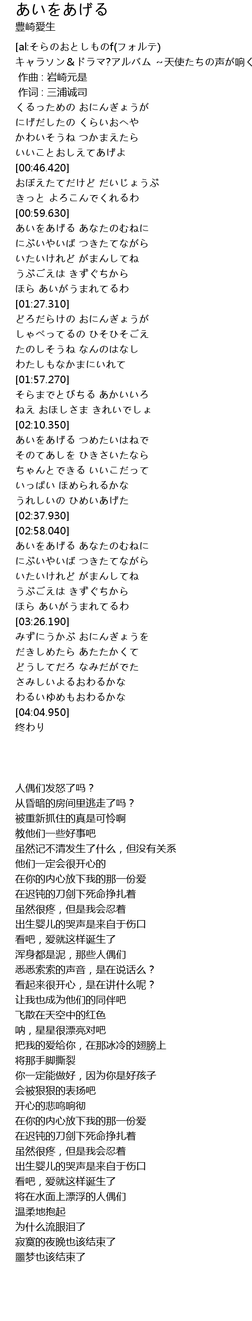 | [03:35.750] | みずにうかぶ おにんぎょうを |