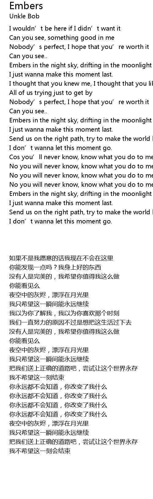 | [00:51.23] | Embers in the night sky, drifting in the moonlight |