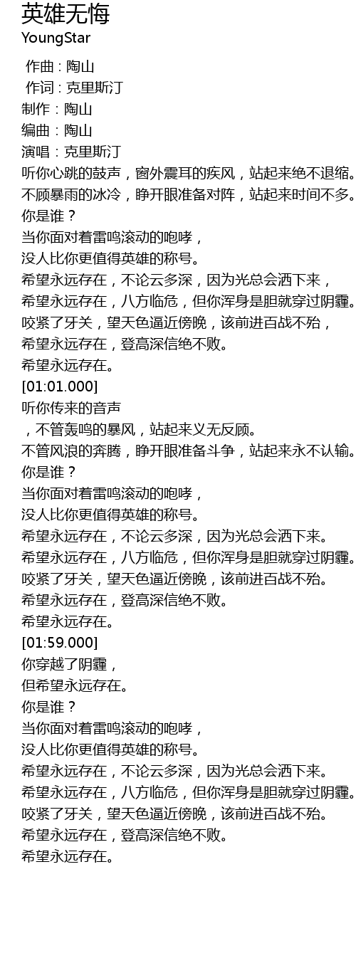 | [01:40.000] | 希望永远存在,八方临危,但你浑身是胆就穿过阴霾。 |