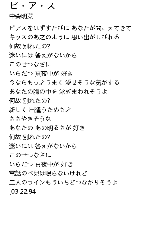 | [00:23.80] | ピアスをはずすたびに あなたが聞こえてきて |