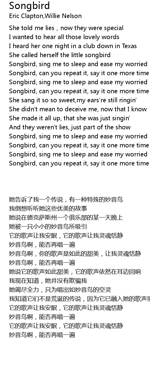 | [00:51] | Songbird, sing me to sleep and ease my worried mind |