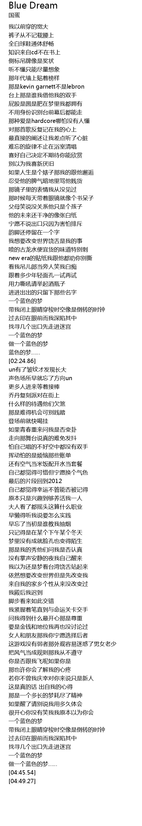 | [04:38.32] | zuò yí gè lán sè de mèng |