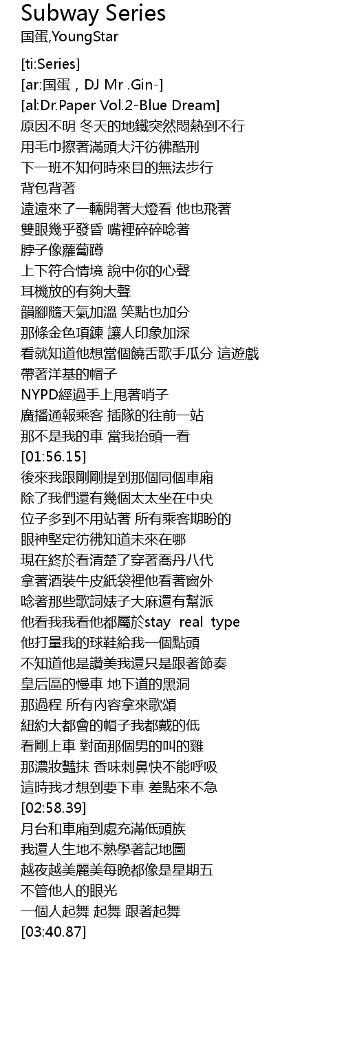 | [02:42.05] | 皇后區的慢車 地下道的黑洞 |