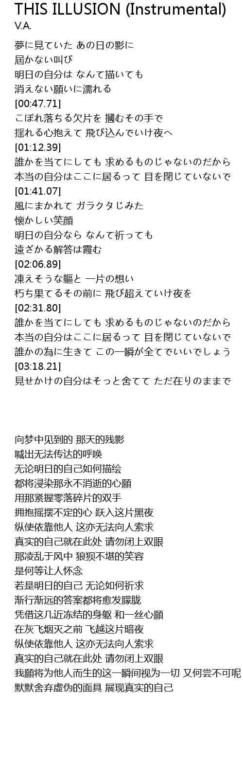 | [03:29.39] | 見せかけの自分はそっと舍てて ただ在りのままで |