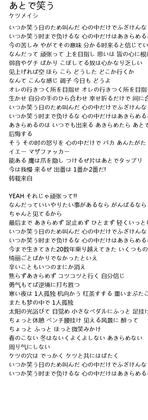 | いつか笑う时まで负けるな 心の中だけはあきらめるな |