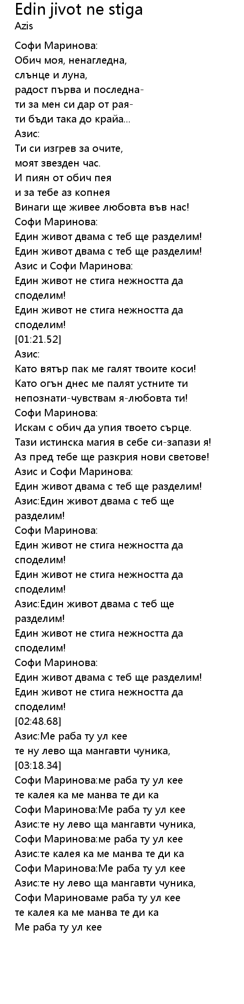 [02:17.26] Азис:Един живот двама с теб ще разделим!