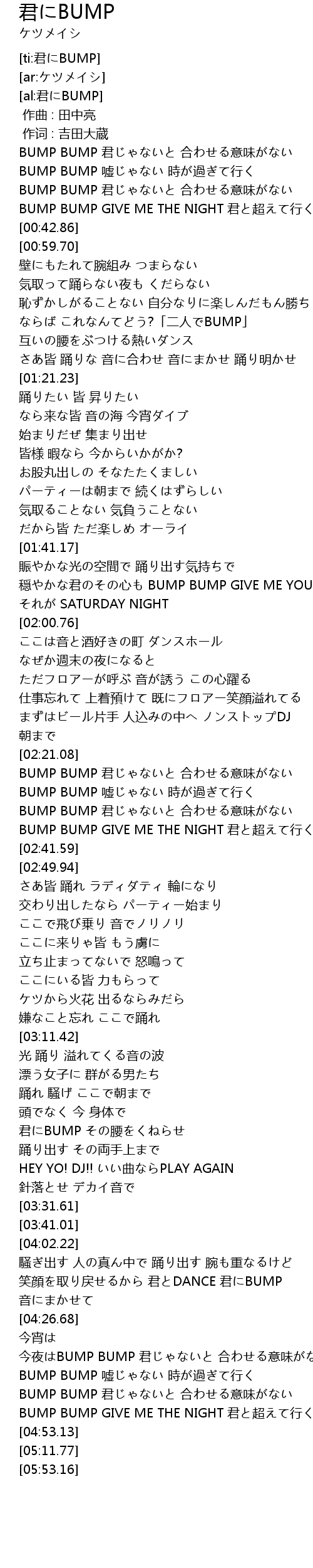 | [02:31.63] | BUMP BUMP 君じゃないと 合わせる意味がない |