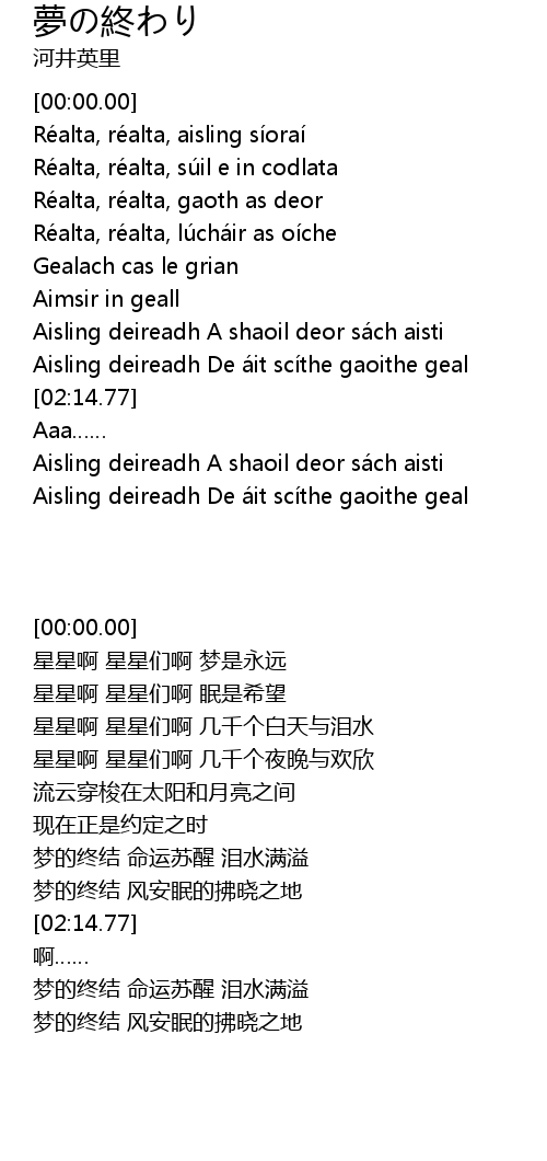 | [00:12.23] | Réalta, réalta, aisling síoraí |