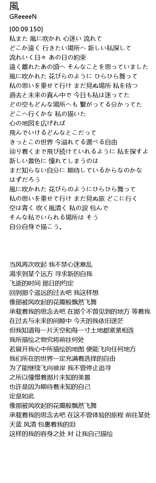| [00:09.990] | 私また 風に吹かれ 心迷い 流れて |