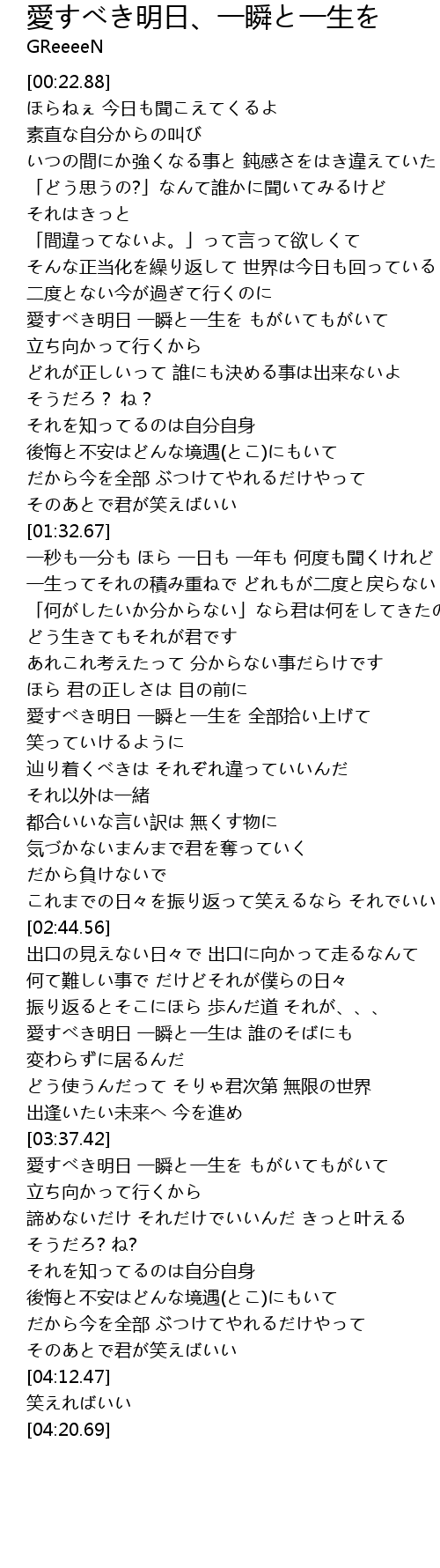 | [03:38.14] | 愛すべき明日 一瞬と一生を もがいてもがいて 立ち向かって行くから |