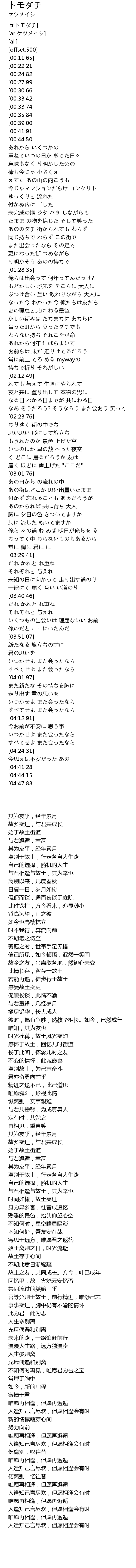 | [02:42.86][00:41.91] | 共に生きてる君に 幸あれ |