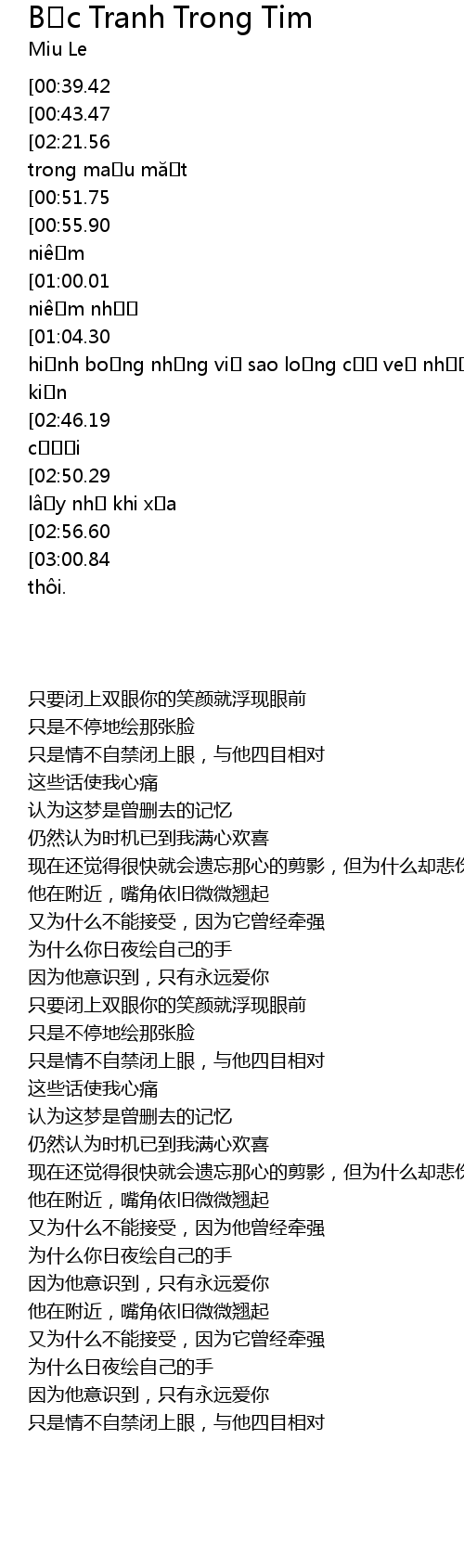 | [02:33.79][01:00.01] | Vẫn cứ ngỡ rằng thời gian đã vơi đi niềm nhớ |