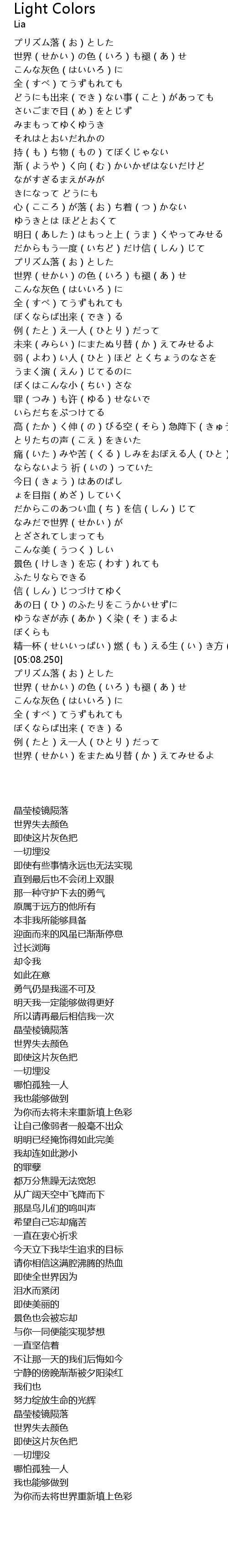 | [05:12.450] | 世界(せかい)の色(いろ)も褪(あ)せ |