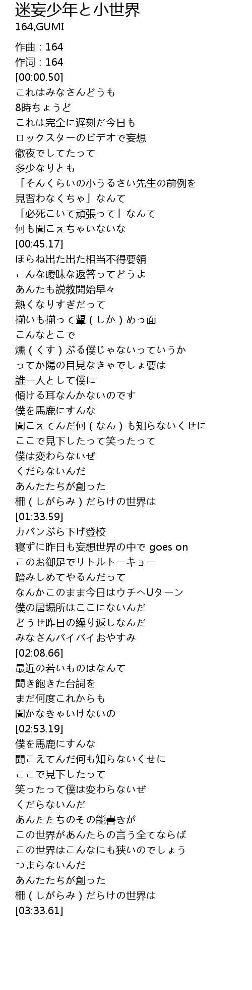 | [01:50.97] | 寝ずに昨日も妄想世界の中で goes on |