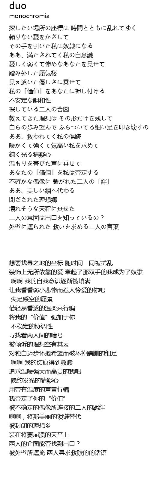 | [02:08.11] | 不確かな偶像に 繋がれた二人の「絆」 |