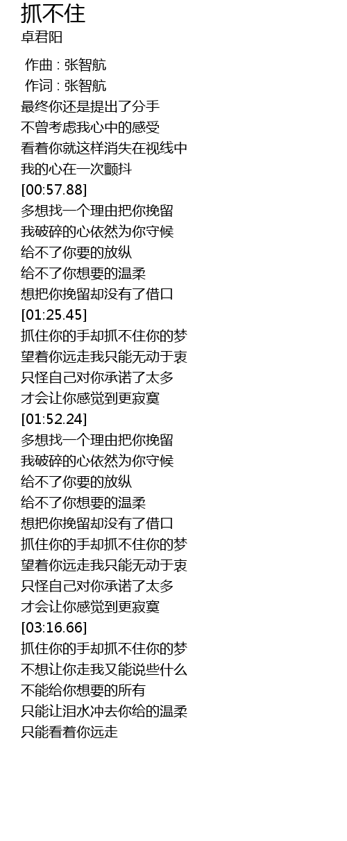 | [01:26.65] | zhuā zhù nǐ de shǒu què zhuā bú zhù nǐ de mèng |