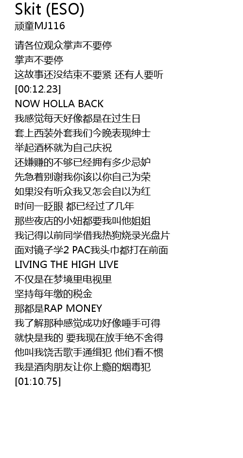 | [01:03.12] | 他叫我饶舌歌手通缉犯 他们看不惯 |