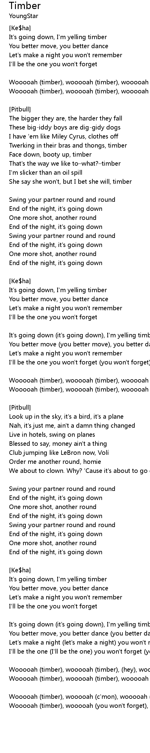 | Wooooah timber, wooooah you won' t forget, wooooah timber |