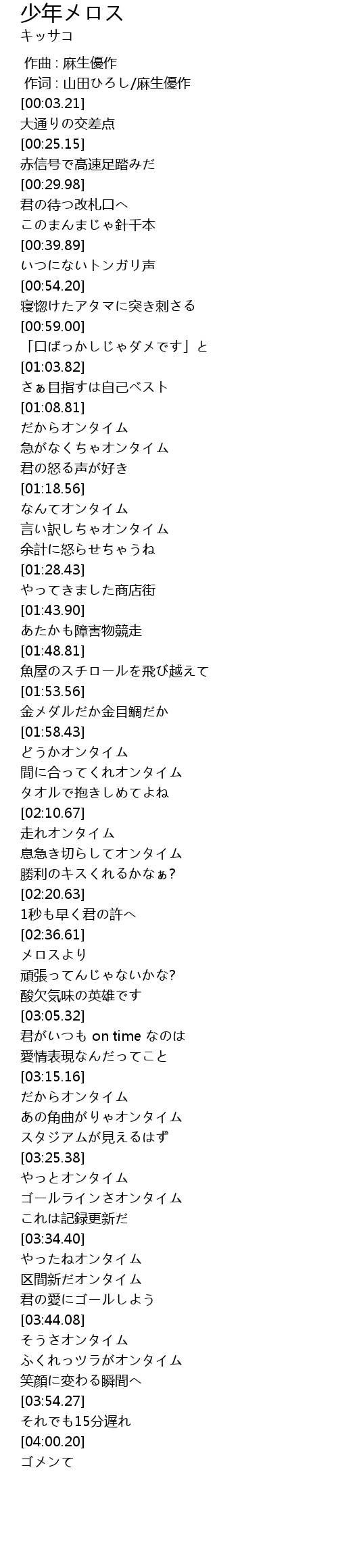| [03:18.87] | あの角曲がりゃオンタイム |