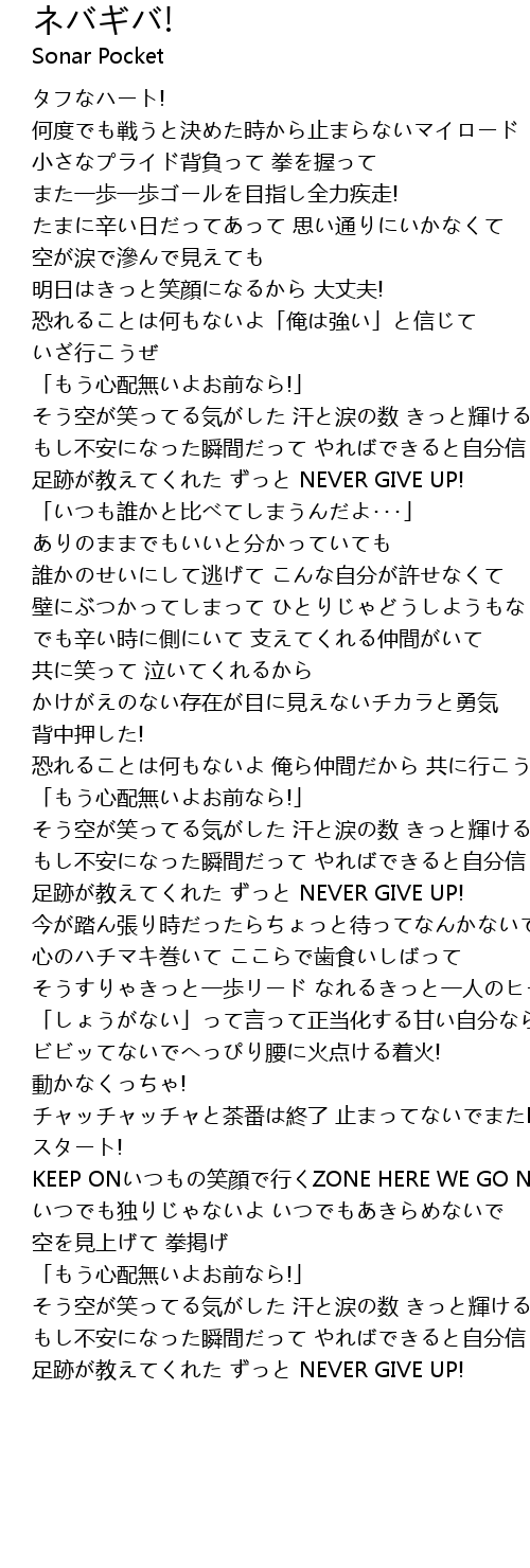 | いつでも独りじゃないよ いつでもあきらめないで 空を見上げて 拳掲げ | |
