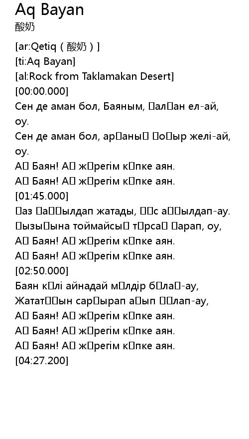 | [03:47.500] | Ақ Баян! Ақ жүрегім көпке аян. |