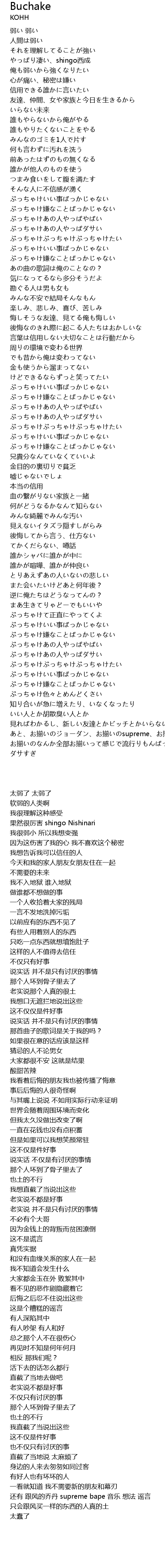 | [03:58.021] | あと、お揃いのジョーダン、お揃いのsupreme、お揃いのエイプ、お揃いの音楽、お揃いの考え、お揃いの噂話 |