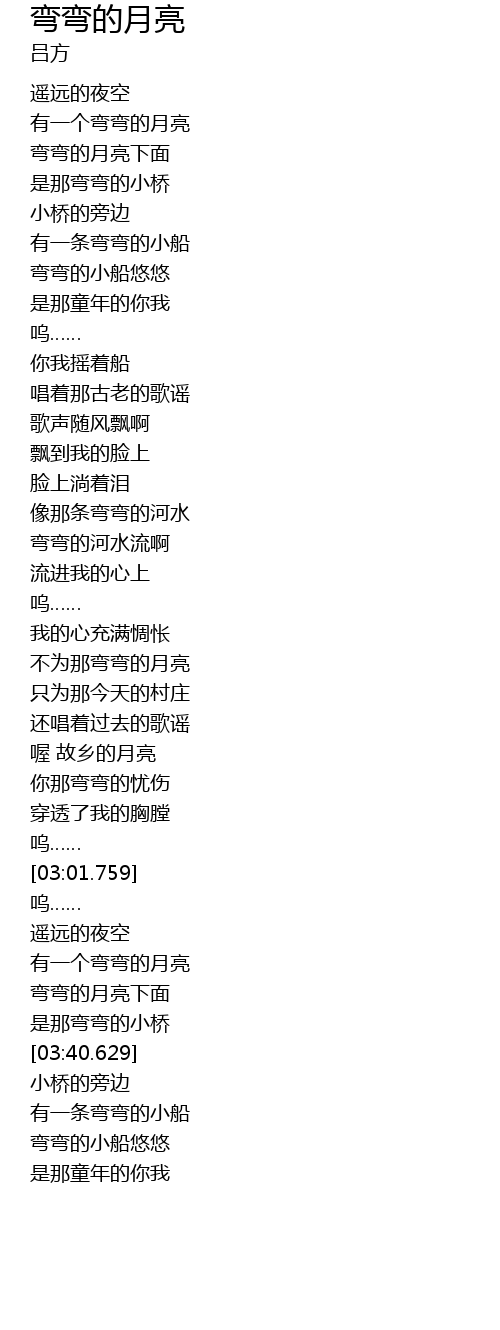 | [03:28.329] | yǒu yí gè wān wān de yuè liàng |