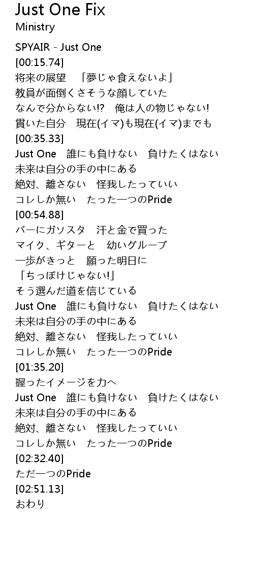 | [02:13.97] | Just One 誰にも負けない 負けたくはない |