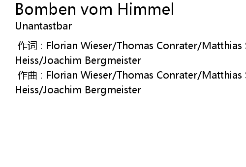 | [00:00.000] | 作曲 : Florian Wieser/Thomas Conrater/Matthias Speranza/Christian Heiss/Joachim Bergmeister |