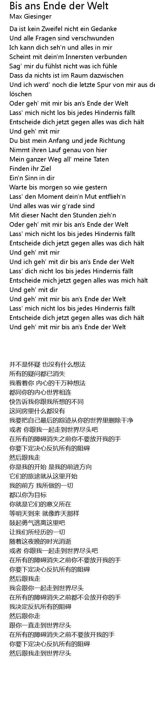 | [02:32.287] | Oder geh' mit mir bis an' s Ende der Welt |