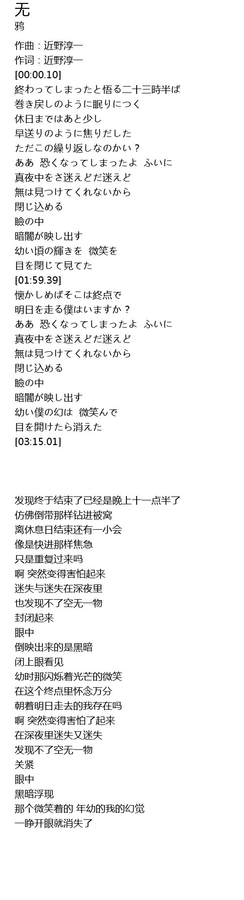 | [00:33.34] | 終わってしまったと悟る二十三時半ば |