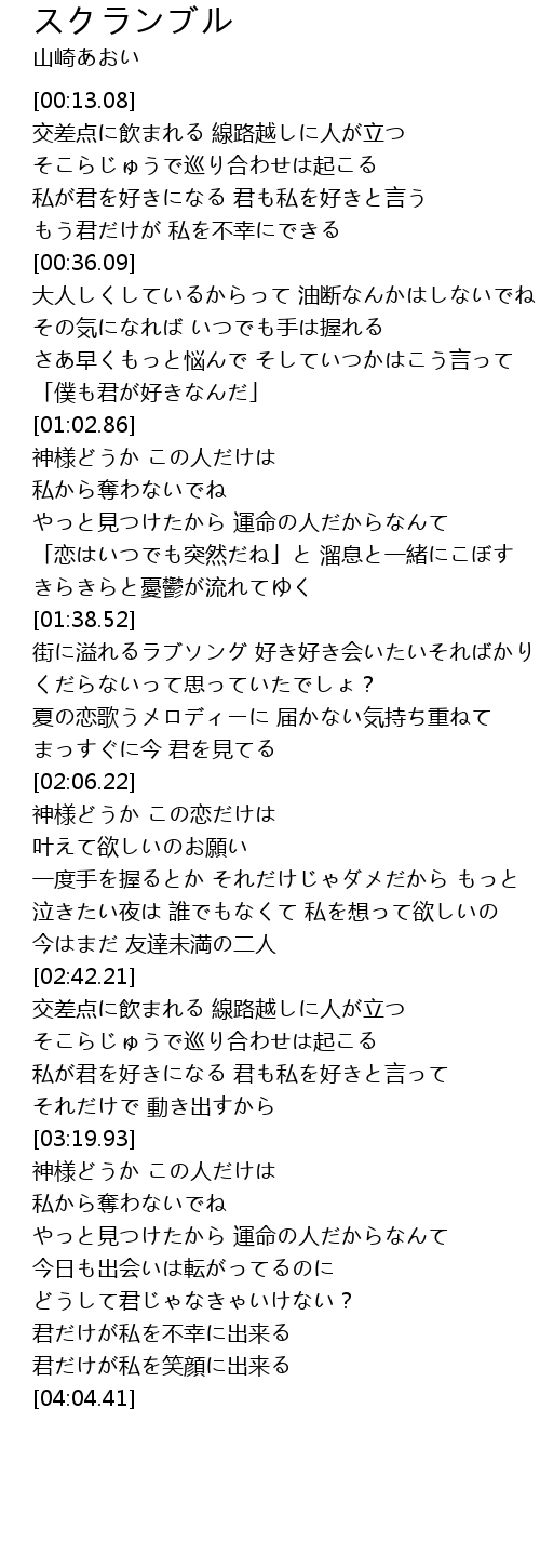 | [03:00.13] | 交差点に飲まれる 線路越しに人が立つ |
