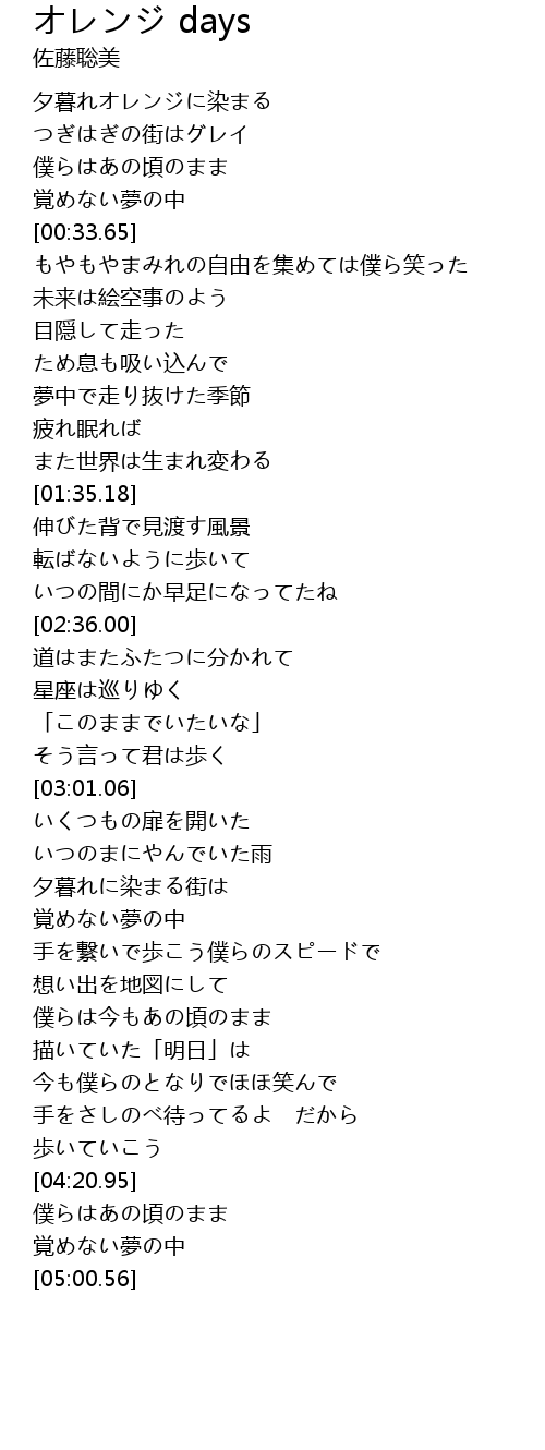 | [00:11.25] | 夕暮れオレンジに染まる |