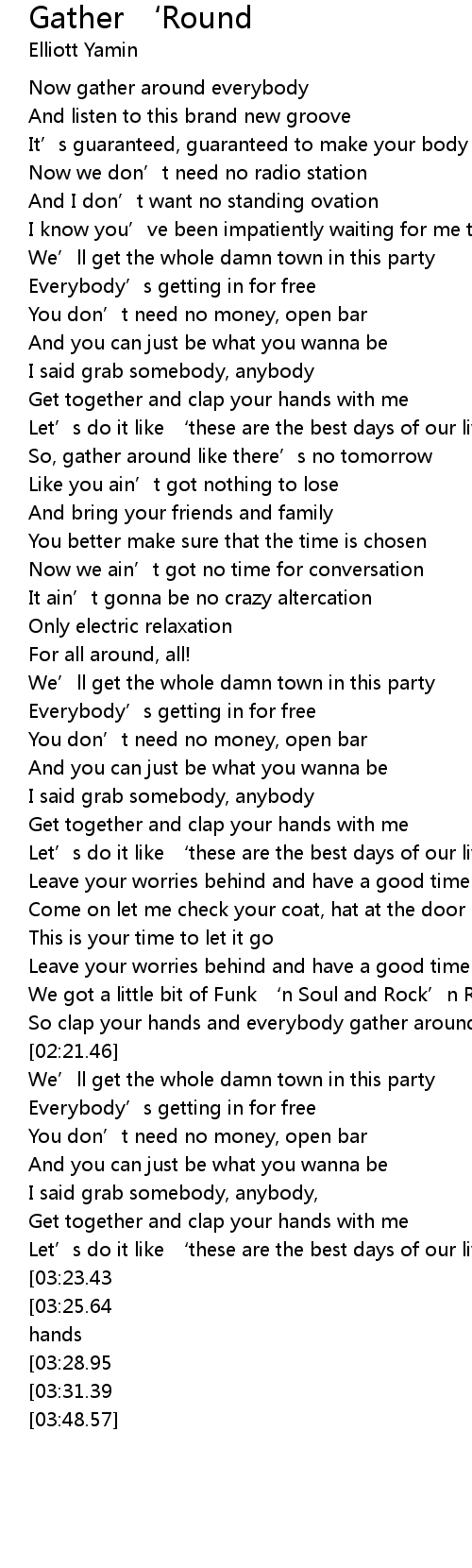 | [03:36.77][03:25.64][03:14.56][03:03.02] | C' mon get together just clap your hands |