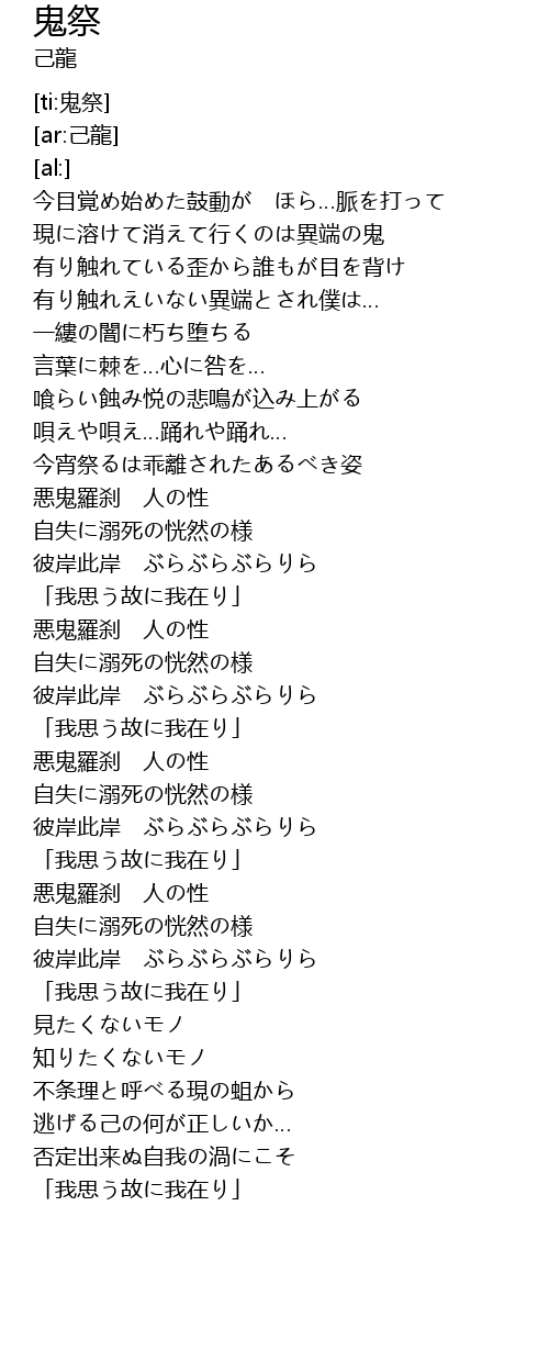 | [00:47.64] | 現に溶けて消えて行くのは異端の鬼 |