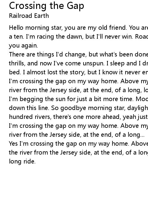 Yes I'm crossing the gap on my way home. Above my head just sky and stone. Cross the river from the Jersey side, at the end, of a long, of a long, of a long, long ride. |
