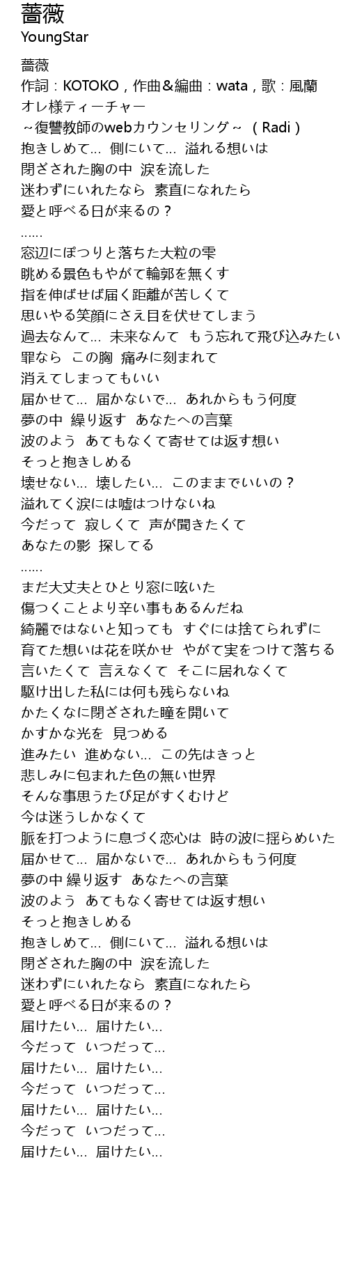 | [00:03.00] | 作詞:KOTOKO,作曲&編曲:wata,歌:風蘭 |